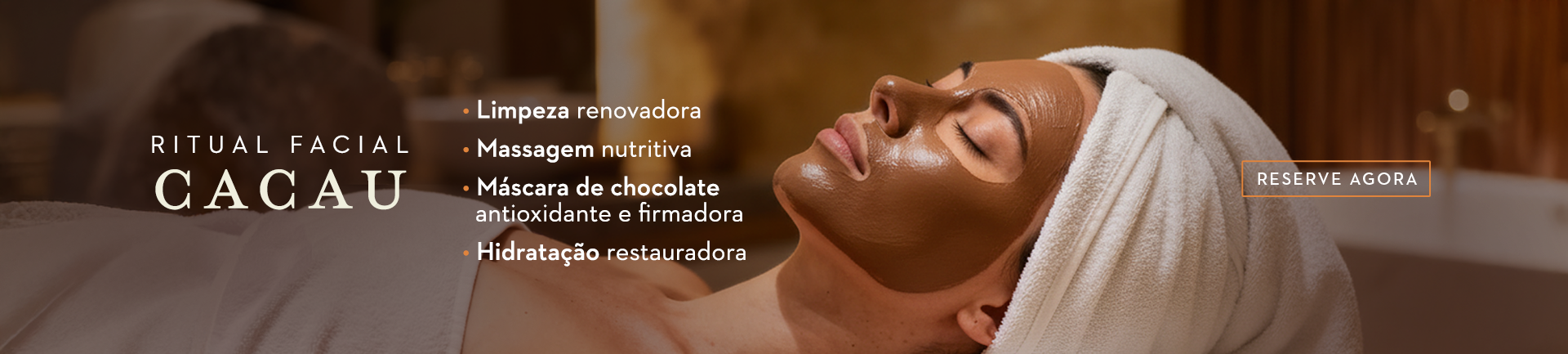 Descubra o Ritual Facial de Cacau do Amanary Spa: 50 min de cuidado, aroma envolvente, máscara de chocolate antioxidante e revitalização da pele..